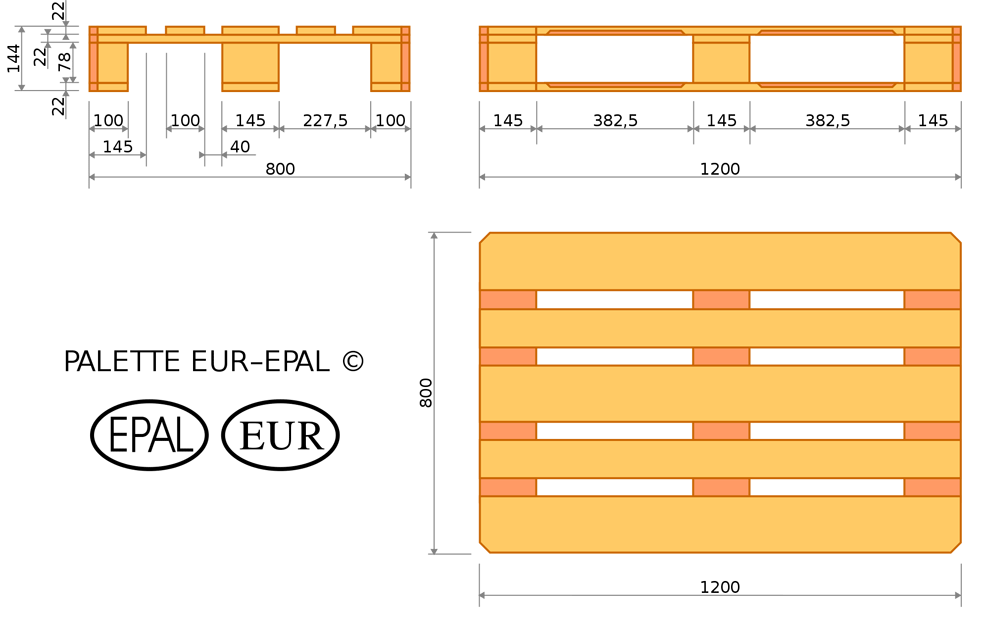 Die Größen von Holzpaletten variieren von Land zu Land, abhängig davon, zu welchem Zweck sie eingesetzt werden. Jedoch ist die am häufigsten eingesetzte Palettenabmessung in Europa 1200 x 800 mm.