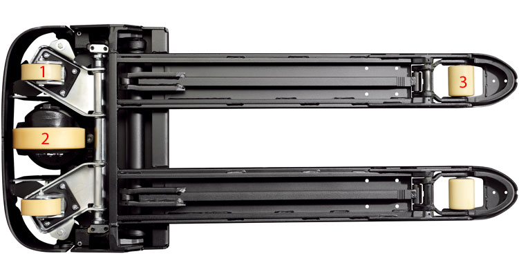2) Antriebsrad: Durch das Platzieren des Antriebsrades auf der Mittellinie des Gerätes wird der Hubwagen nicht mit Seitenmomenten beaufschlagt, wenn das Antriebsrad nach dem Durchdrehen (zum Beispiel auf nassem Untergrund oder im Gefälle) seine Griffigkeit zurückerlangt. Mit einem außermittigen Antriebsrad können in diesen Situationen beachtliche Seitwärtsbewegungen das Fahrzeug aus der Spur bringen.